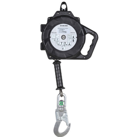 Довжина тросу автоматично регулюється в залежності від місця положення працівника. Гальмівний механізм моментально спрацьовує при зміненні швидкості витягування тросу. Шлях гальмування не перевищує 0,5 м.