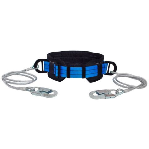 Пояс монтажний даної моделі комплектується двома стропами із сталевого тросу і малими карабінами з шириною розкриття 20мм. Пояс застосовується при виконанні вогневих робіт на висоті, а також під час роботи, де можливе термічне чи механічне пошкодження стропу. Стропа виготовленні із сталевого тросу, і мають меншу вагу в порівнянні з ланцюговими.