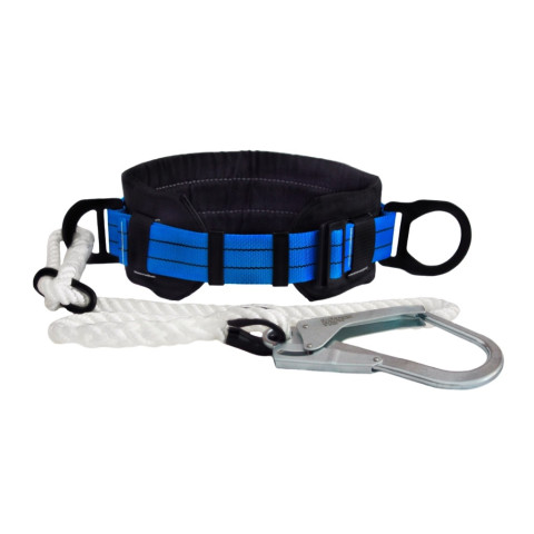 Пояс монтажний даної моделі комплектується канатним стропом і великим карабіном з шириною розкриття 55мм. Пояс застосовується при роботах де виключене пошкодження стропу, а також під час виконання електромонтажних і інших робіт, де необхідне використання стропу із ізольованого матеріалу. Строп виготовлений із поліамідного канату, має регулятор довжини.