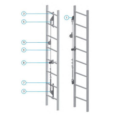 Система складається з направляючої вертикальної анкерної лінії, виконаної із сталевого нержавіючого тросу діаметром 8 мм. Нижній кінець направляючої обладнаний натягувачем. Верхній кінець направляючої прикріплений до стаціонарної конструкції за допомогою гвинтового карабіну. Направляюча довжиною більше 10 м обладнується провідником тросу, який захищає направляючу від вібрацій, викликаних, наприклад, вітром. Повзунок представляє собою індивідуальне оснащення користувача, встановлене на направляючій на випадок необхідності використання системи безпеки. Повзунок переміщається по тросу догори і донизу під час нормального переміщення користувача і блокується на тросі у випадку падіння користувача.