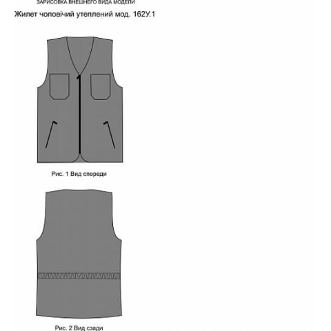 Жилет утеплений подовжений, з центральною застібкою «блискавка» з одним бігунком, з V- подібною горловиною.