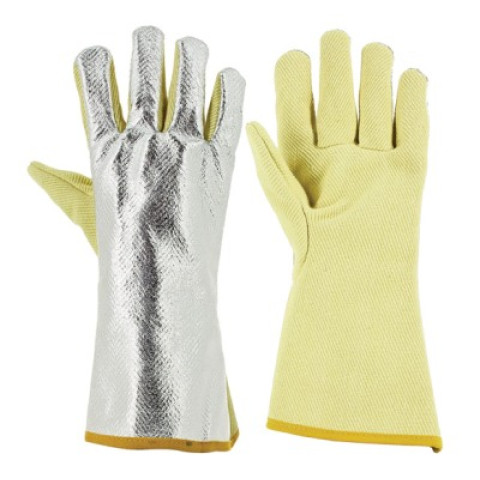 Перчатки защитные многослойные термостойкие. Выполнены из арамидной ткани на полной плотной подкладке из 100% хлопка. Тыльная часть ладони покрыта алюминием, что позволяет обеспечить высокий уровень защиты от лучистого тепла. Устойчивы к высоким температур при контакте с поверхностью 250° C, и брызгам расплавленного металла. Устойчивы к воспламенению, не распространяют горение. Перчатка обеспечивает защиту от порезов и механических воздействий.